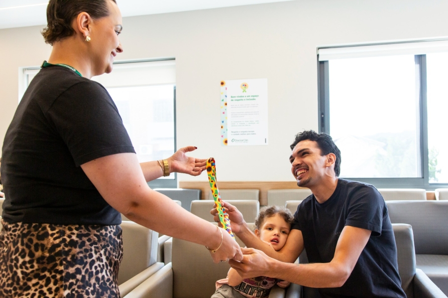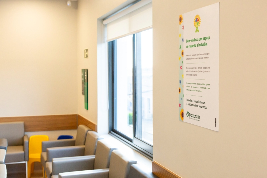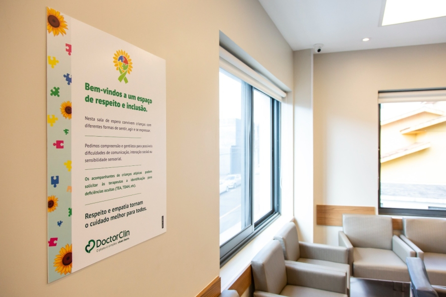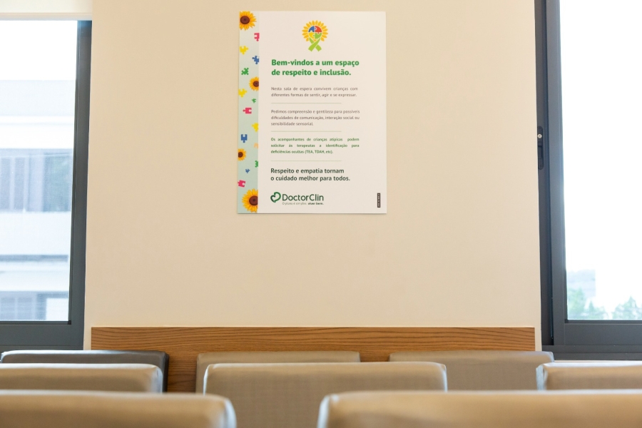 Paralelamente, a Doctor Clin implantou placas informativas e identificação por crachás nos ambientes compartilhados, reforçando o caráter inclusivo dos espaços terapêuticos, onde convivem crianças com e sem desenvolvimento atípico. A sinalização nas salas de espera destaca que o ambiente é um espaço de respeito e inclusão, alertando para possíveis dificuldades de comunicação, interação social ou sensibilidade sensorial, como sons e luzes intensas. A proposta é conscientizar sobre manifestações que podem ocorrer, como gritos ou maior sensibilidade, promovendo empatia e convivência harmoniosa.