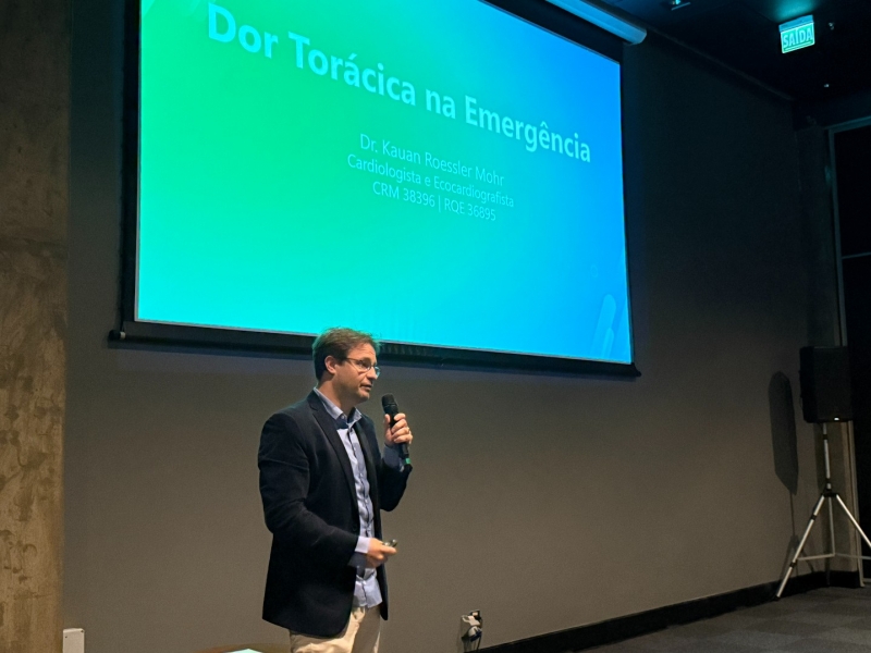 Ao longo da noite, especialistas de diferentes áreas compartilharam experiências e saberes sobre práticas clínicas. O cardiologista Dr. Kauan Mohr foi o primeiro palestrante. Em sua abordagem ele trouxe conceitos e orientações importantes a serem seguidas nos casos de pacientes que chegam com dor torácica na emergência.