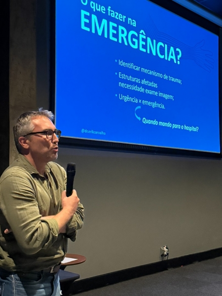 Após, o ortopedista Dr. Erik Henrichsen de Carvalho falou do Atendimento Inicial, explicando o que fazer na emergência. Em sua apresentação, relatou como identificar mecanismo de trauma, estruturas afetadas e a necessidade de exames e a diferenciação entre emergência e urgência.